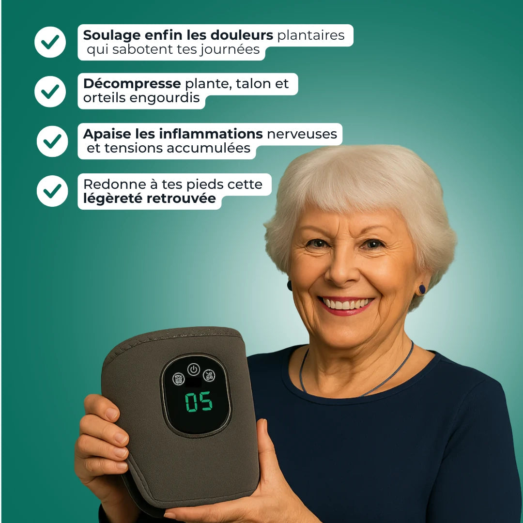 La seule solution non médicamenteuse qui combine massage, chaleur et compression pour réactiver la circulation, apaiser les nerfs et redonner vie à vos pieds.